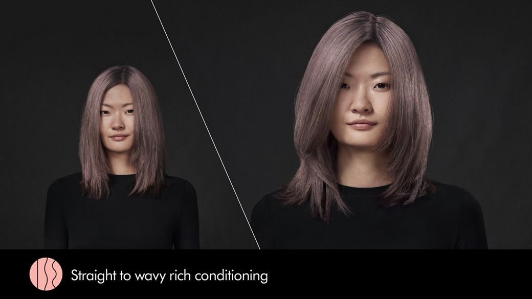 Model uses Pre-style cream Straight to wavy rich conditioning on her naturally straight hair. Styled with Dyson Airstrait™ straightener, finished with Dyson Chitosan™ Post-style serum.