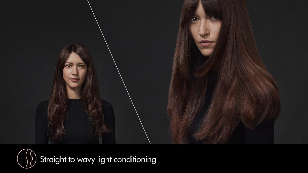 Model uses Pre-style cream Straight to wavy rich conditioning on her naturally straight hair. Styled with Dyson Airstrait™ straightener, finished with Dyson Chitosan™ Post-style serum.