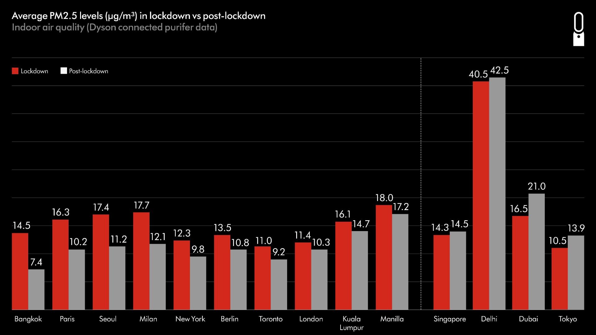 As lockdown descends on cities across the world once again, Dyson urges people to consider their indoor air pollution levels at home. Dyson purifier data collected from initial lockdowns in 14 cities globally indicated higher PM2.5 levels during lockdown compared to post-lockdown, highlighting the impact that spending more time indoors may be having on exposure to pollution.